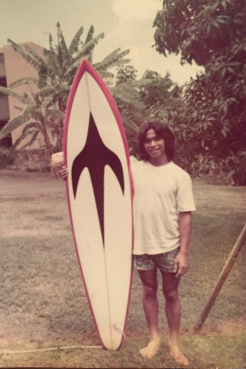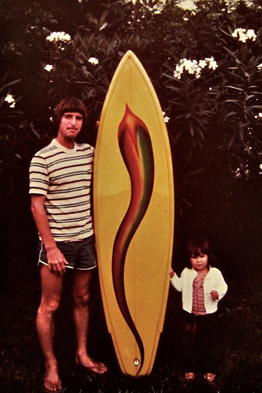 Twelve years old and inspired, Daniel went on to shape his own board from the front-half of a broken rhino chaser salvaged from the beach, riding it all over Oahu. The board ultimately reached France, by the grace of Rell Sunn, who brought a dozen Oahu groms to the surf festival in Biarritz. It can still be found today, tan as the sands, shackled up to the outdoor shower at the Jones compound – Rocky Point, Hawaii.